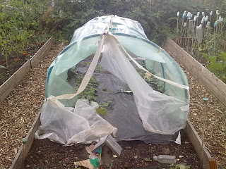 I decided that I needed more room in the Greenhouse, so I put one of my aubergine plants out to play in the Sweet Potato Suite as I believe it will have a similar enviroment to the Greenhouse one and it won't distrub the Sweet Potatoes, which as you can see are doing very well.